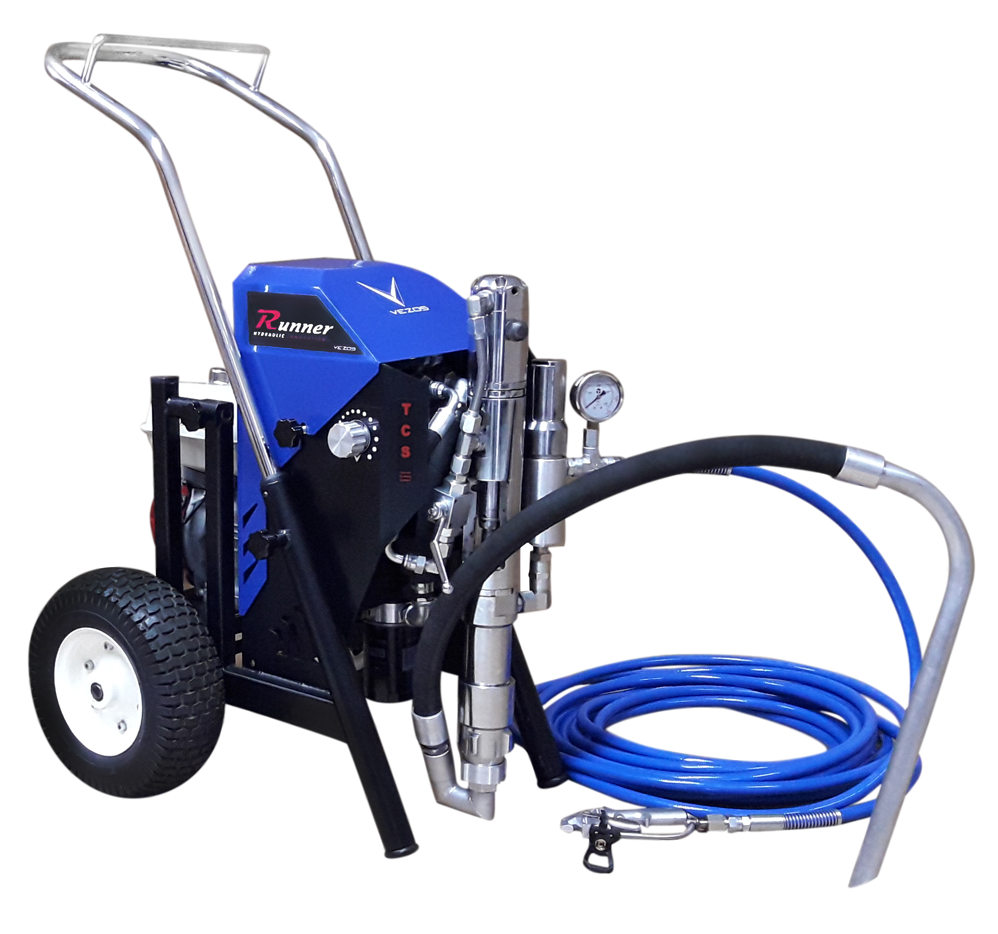 On the spot, no tools required, paint supply method conversion. Runner Hydraulic Paint & Texture Airless sprayers, are available with a direct immerse paint pump and an easy on the spot paint suction hose kit. Using an immerse paint pump is perfect when spraying texture or stucco paste. The pimp can easily be cleaned due to the textures material, but the same cannot be said for paint materials, as washing off the paint from an immerse direct pump is a difficault task. VEZOS Runner range has an easy to change suction hose paint kit, allowing the user to convert the paint pump for a direct immerse pump to a suction hose kit within seconds, simply by removing the lower pump ending and adapting the suction hose kit and without any tools necessary.